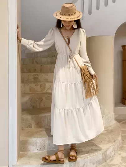 DAZY Vestido unicolor con nudo delantero bajo a capas - Beis - Añade 5
