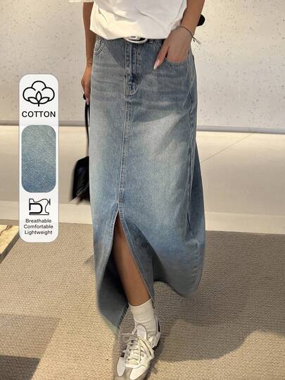 DAZY Falda vaquera casual y versátil con bolsillo y abertura asimétrica en degradado para adolescentes - Lavado ligero - Añade 3