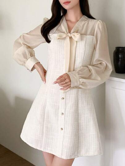 DAZY Vestido con cuello de corbata, botones delanteros y mangas abullonadas, vestido de otoño - Albaricoque - Añade 1