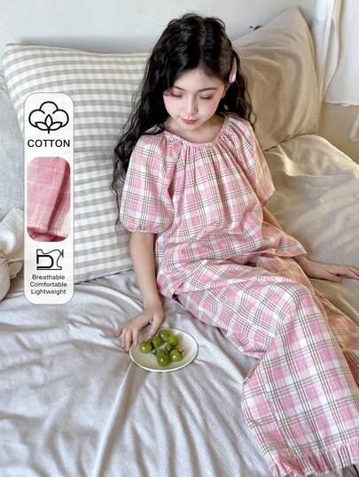 DAZY Conjunto de pijama para niña preadolescente con blusa de manga corta con estampado de cuadros y pantalones anchos de pierna ancha con volantes, para primavera/verano/otoño - Rosa - Añade 7