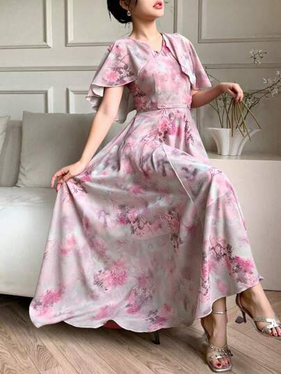 DAZY Vestido de mujer con cuello en V, estampado floral, mangas con volantes y longitud hasta la pantorrilla. Vestido largo de manga larga para otoño, atuendo de vacaciones - Rosa - Añade 10