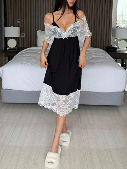 DAZY Camisón de pijama con tirantes de espagueti, cintura ceñida y parches de encaje de color contrastante para mujer - Negro - Añade 1