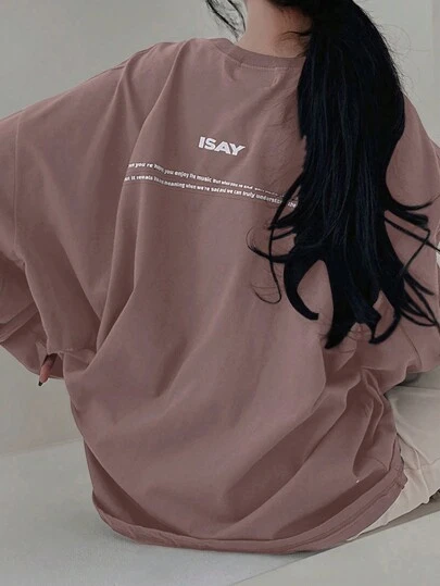 DAZY Camiseta suelta de cuello redondo con estampado de letras morada, versátil para primavera y otoño - Púrpura polvoriento - Añade 4