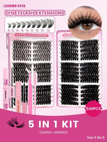 Set de pestañas postizas DIY, 560 pestañas individuales, rizado 40D/50D/60D/80DD, 9-16mm, suaves y esponjosas, incluye pincel, adecuado para principiantes en casa o uso en salón - Rosa - Añade 5