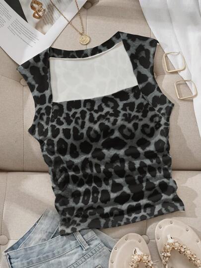 SHEIN EZwear Camiseta sin sujetador de cuello de pico con estampado de leopardo oscuro, fruncida en el busto y con acolchado, apropiada para el verano - Negro - Añade 1