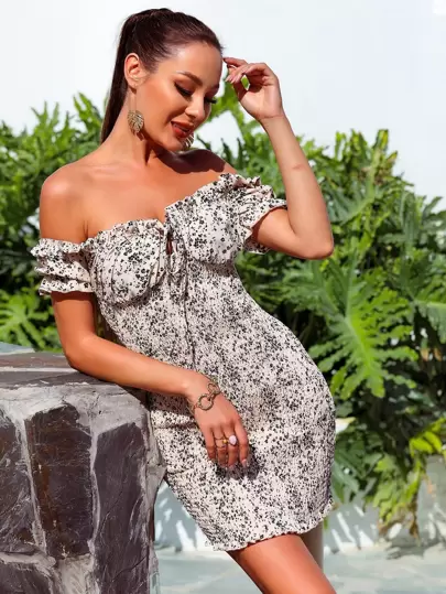 Vestido con fruncido de hombros descubiertos con estampado floral de margaritas - Multicolor - Añade 1