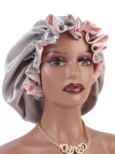 Gorro de satén con redecilla de spandex de doble capa y parches decorativos para dormir y usar con peluca - Rosa - Añade 1