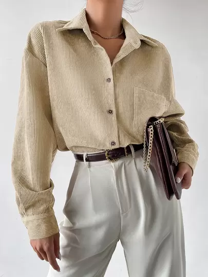 SHEIN Essnce Camisa de hombros caídos con botón con parche de bolsillo de pana - Caqui - Añade 6