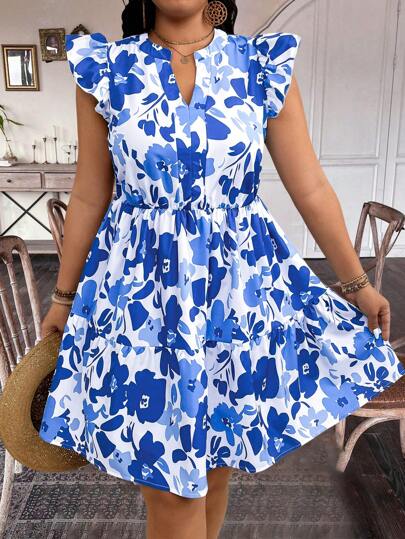 EMERY ROSE Vestido casual con mangas de capucha de talla grande con estampado aleatorio - Azul - Añade 6