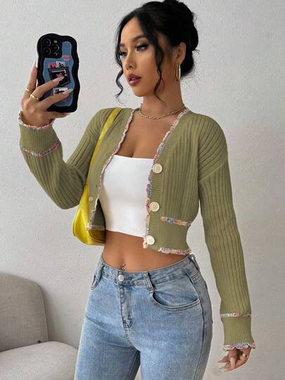 EMERY ROSE Cárdigan de punto corto de manga larga con hombros caídos y abotonadura sencilla, elegante para mujer, otoño - Verde Oliva - Añade 1