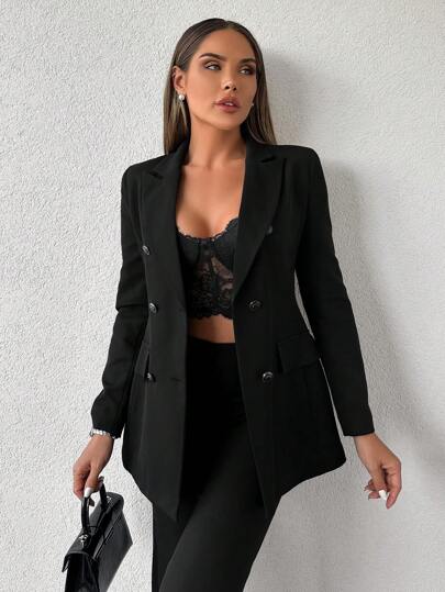 EURMUSE Blazer de cuello con solapa de doble botonadura - Negro - Añade 1