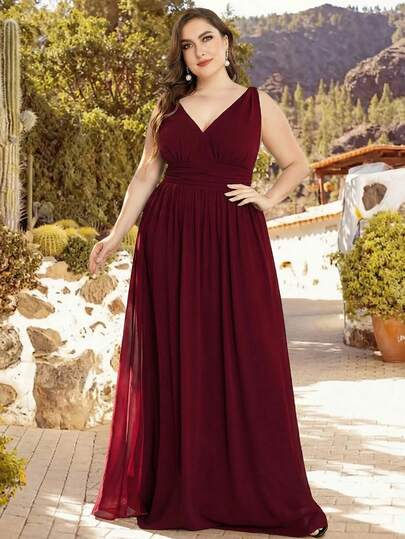 Vestido formal de talla grande con cuello en V doble, cintura fruncida y sin mangas, vestido de dama de honor elegante color borgoña, vestido formal para invitados de boda, primavera/verano - Granate - Añade 1