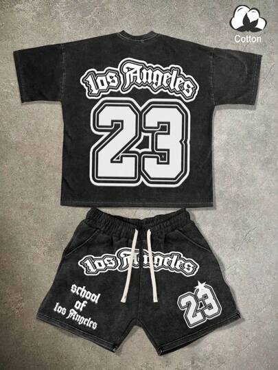 Manfinity EMRG Conjunto de pantalones cortos y camiseta de hombre de algodón para verano con estampado de letra y cordón, conjunto de estilo casual de calle - Multicolor - Añade 1