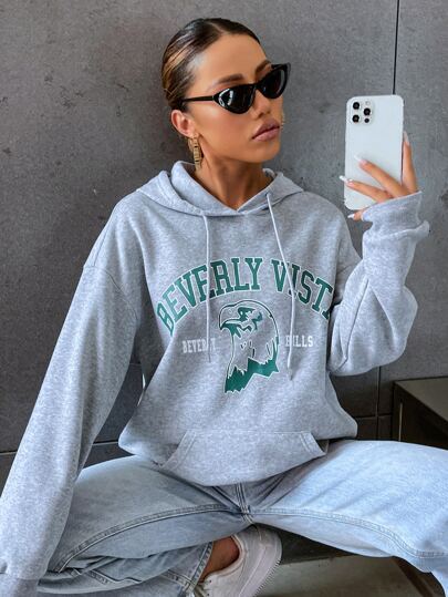 SHEIN Unity Capucha con estampado de águila y letra de hombros caídos con bolsillo de canguro con cordón - Gris Claro - Añade 5