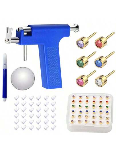 Kit de perforación de orejas Pistola de perforación de orejas profesional con 36 piezas de pendientes de aro de aleación para uso en salón y hogar - Pistolita azul + 36 pendientes en caja - Añade 2