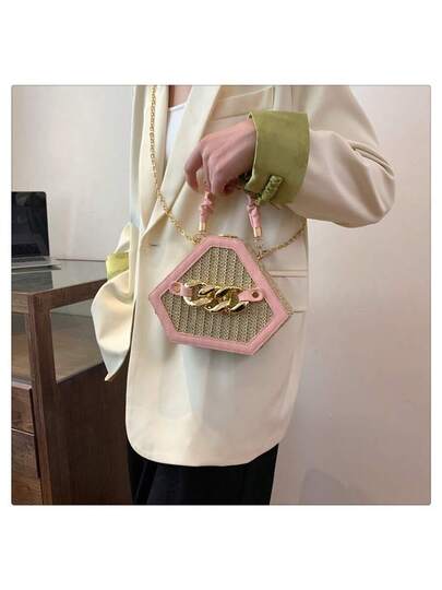 Bolso de paja tejido para mujer, bolso de hombro de paja hecho a mano para mujer, adecuado para la playa, viajes diarios y vacaciones. (Negro/Blanco/Rosa) - Rosa - Añade 1