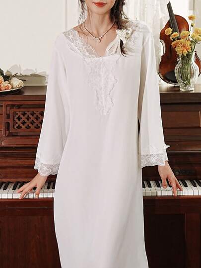 Camisón elegante de mujer de encaje francés con aplicaciones - Blanco - Añade 6