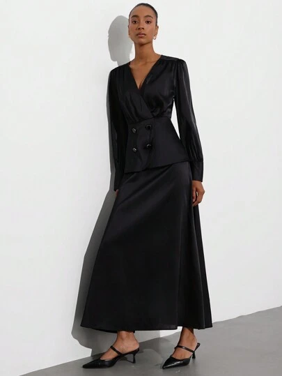 SHEIN Privé Elegante vestido largo con diseño de superposición francesa, mangas abullonadas y volantes para mujer, vestido para ir a la oficina o de commuting - Negro - Añade 2