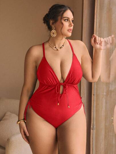 Swim Chiccia Traje de baño de una pieza talla grande con elegante colgante metálico de unicolor y correa ajustable, perfecto para el verano y la playa - Rojo - Añade 7