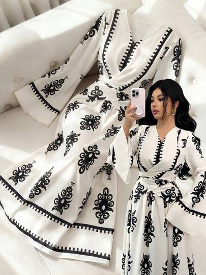 Elenzga Vestido largo de mujer con diseño de envolvente en la cintura, cuello en V y mangas acampanadas, estampado floral retro, para primavera - Multicolor - Añade 1