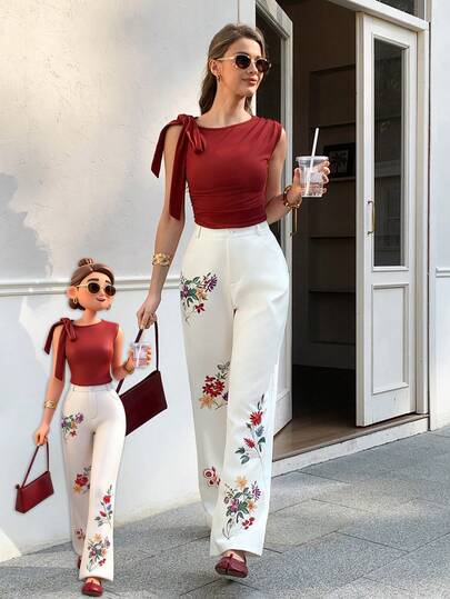 Elyressa Pantalones casuales de pierna ancha con estampado floral para mujeres - Albaricoque - Añade 1