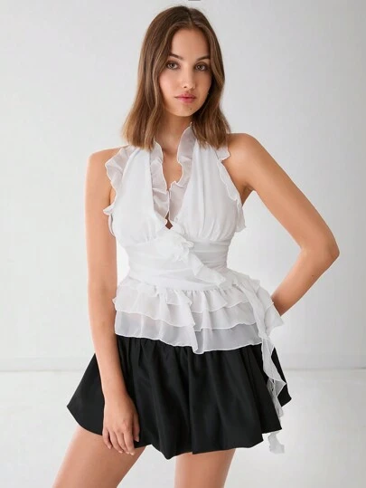 Enchnt Top de mujer de color liso con ribete de volantes y detalles de malla, estilo minimalista, para uso casual y en vacaciones - Blanco - Añade 1