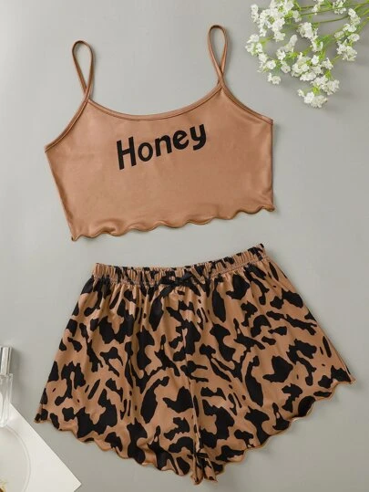 Conjunto De Pijama Con Cami Y Ribete De Borde Festoneado Con Gráficos De Letra - Multicolor - Añade 2