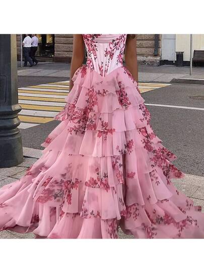 Vestido sin mangas con estampado de moda para mujeres de estilo europeo y americano, con volantes, escote sin tirantes y abertura lateral