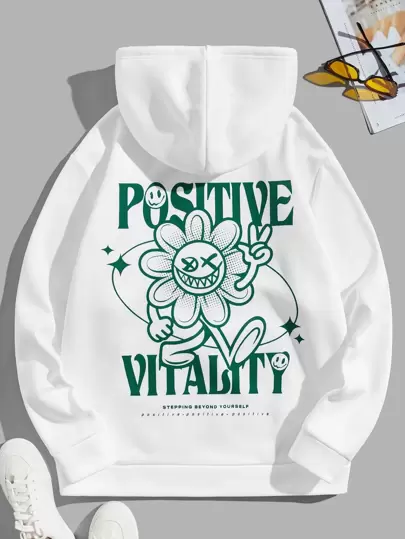 Manfinity VCAY Sudadera con capucha térmica con bolsillo con cordón, eslogan y gráfico de dibujos animados para hombres, para otoño e invierno - Blanco - Añade 1