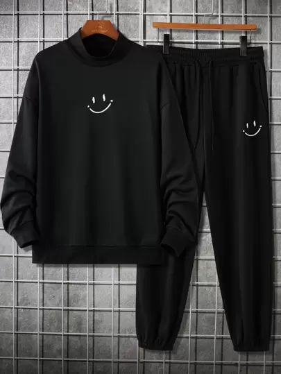 Manfinity Hombres Pantalones deportivos con sudadera con estampado de dibujos animados de cuello alto de hombros caídos - Negro - Añade 1