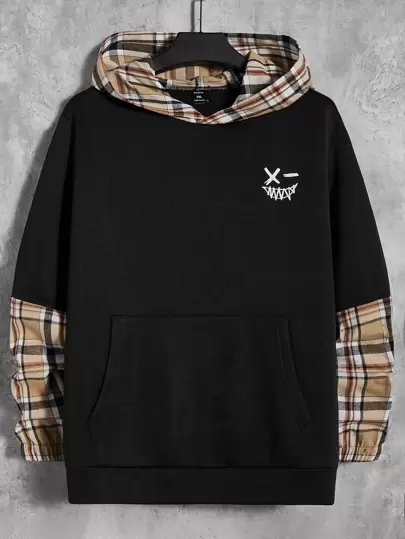 Manfinity RebelGame Hombres Capucha panel de cuadros con estampado de expresión con bolsillo de canguro - Negro - Añade 4