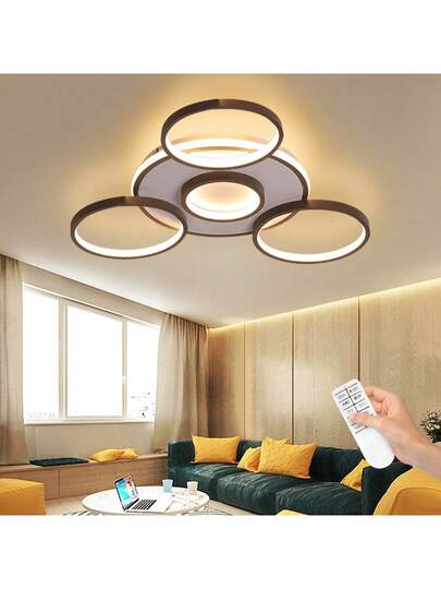 Elegante luz de techo LED de 7 anillos en tono café con atenuación infinita, control remoto para sala de estar, dormitorio, cocina - Iluminación ajustable de 3000-6500 K - HY-PL0005-5H-CR - Añade 4