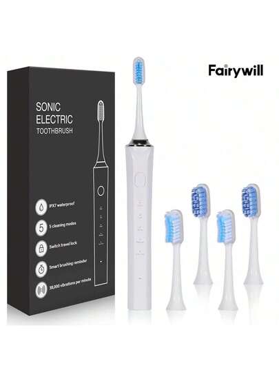 Fairywill Sonic Electric Toothbrush USB Tongue Cleaner Timer 5 Mode 4 Brush Head - Blanco - Añade 4