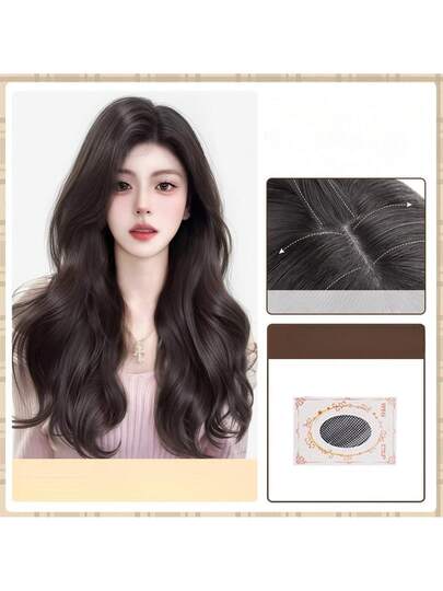 Peluca de cabello largo y ondulado de verano, cabello largo y rizado con efecto de ambiente de viento, simulación de cabello humano con raya al medio, juego de peluca completa - Cabello rizado al estilo coreano [castaño oscuro] - Añade 1