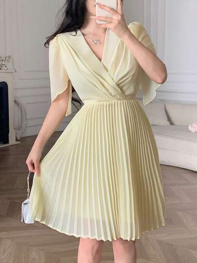 Feyla Vestido corto de mujer de unicolor y cuello en V minimalista de manga corta, para uso casual diario - Amarillo claro - Añade 1
