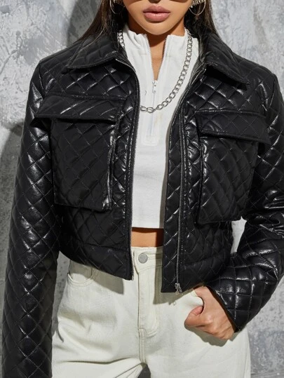 SHEIN Cazadora con bolsillo con solapa guateado PU - Negro - Añade 1