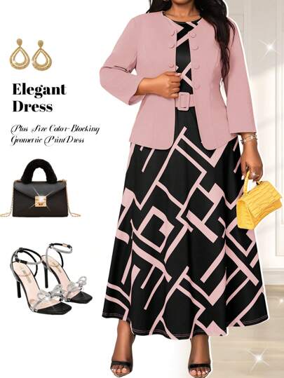 Fleurora Conjunto de vestido y atuendo de trabajo casual con bloqueo de color y estampado geométrico, talla grande, para otoño - Rosa - Añade 1