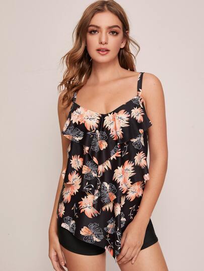 Tankini de verano de capas escalonadas con estampado floral para la playa - Negro - Añade 2