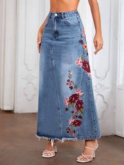 SHEIN LUNE Falda en mezclilla con bordado floral bajo crudo - Azul lavado medio - Añade 1