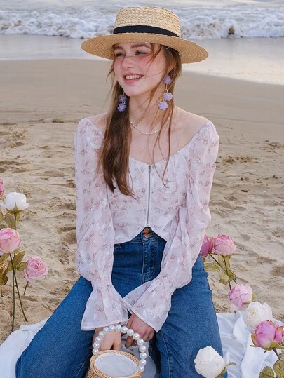 Camisa crop con estampado floral de manga con volante con cremallera - Multicolor - Añade 6