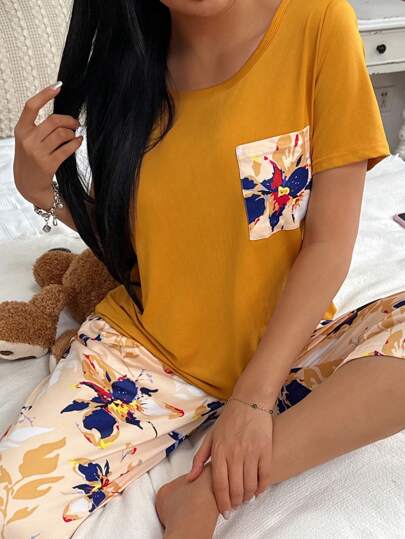 Conjunto de pijama con top de manga corta con bolsillo y pantalones con estampado floral para mujer - Amarillo - Añade 1