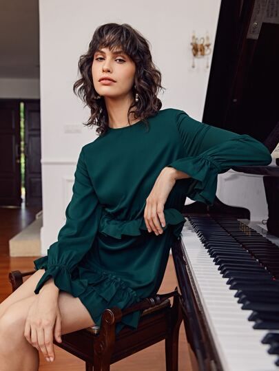 Macario Jimenez Vestido bajo a capas de manga con volante - Verde Oscuro - Añade 5