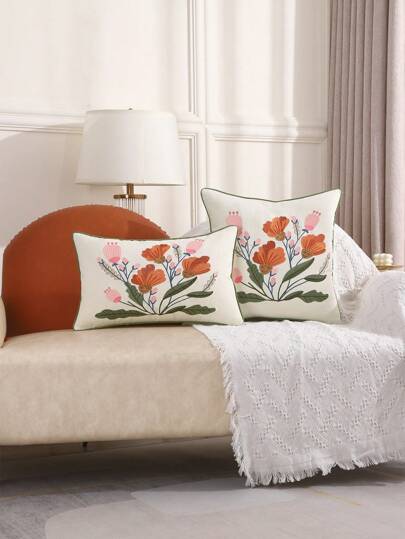 Funda de cojín bordada con flores, de lona, adecuada para la decoración de la sala de estar, primavera/verano - Naranja - Añade 2