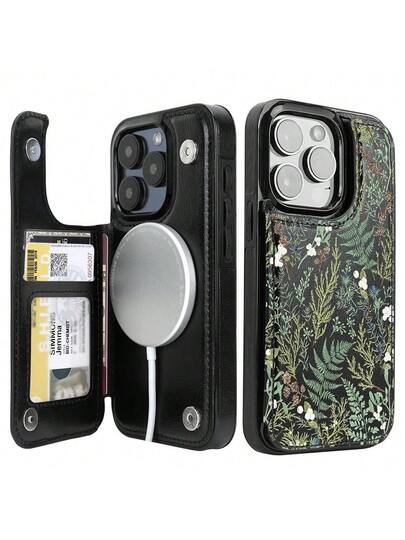Funda tipo cartera con soporte para tarjetas y compatible con MagSafe para iPhone 15 Pro 6.1" [Compatible con MagSafe] Folio de PU con doble imán y protector de lente de cámara (Helechos)