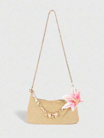 ROMWE Fairycore 1 pieza Bolso de hombro tipo caña de estilo de vacaciones tropicales con elementos marinos y adorno de estrella, Bolso de mano con decoración de flor de lirio - Multicolor - Añade 2