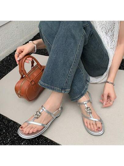 Sandalias retro francesas con tacón grueso y tiras cruzadas y hebilla metálica. - Plateado - Añade 4