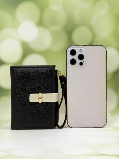 MINGYOU Cartera corta de mujer de PU con parches bicolor, mini bolso estudiantil con broche a presión, cartera multifuncional, estuche de tarjetas compacto y elegante, adecuado como regalo de vacaciones para mujeres - Cartera mini, monedero, cartera pequeña - Negro - Añade 1