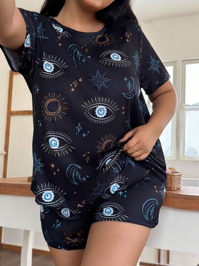 Conjunto de pijama de top de manga corta con cuello redondo y pantalones cortos con estampado divertido, talla grande, conjuntos - Negro - Añade 6