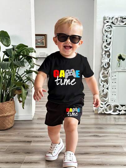 Conjunto de camiseta de cuello redondo y pantalones cortos con estampado de juegos, cómodo y para niño (talla pequeña) - Negro - Añade 1