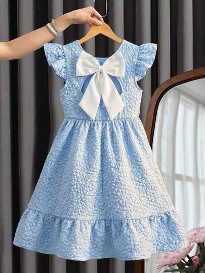 Vestido elegante de fiesta para niñas con mangas abullonadas azul texturizado y lazo blanco midi - Multicolor - Añade 1
